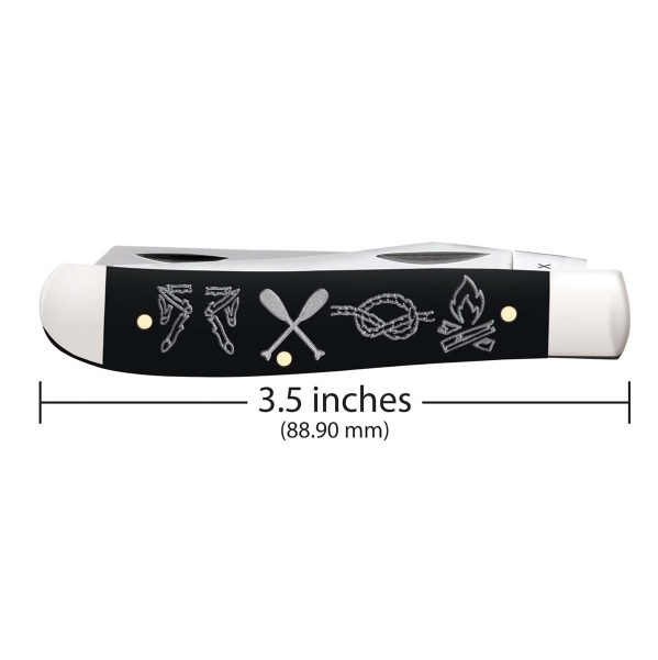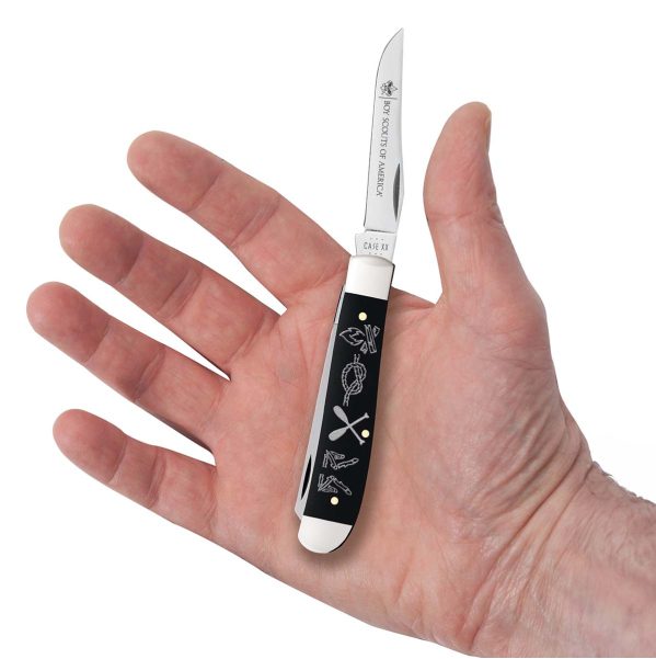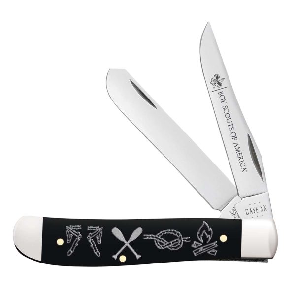 The Scouts BSA Case Mini Trapper Knife combines a smooth black synthetic handle with mirror-polished Tru-Sharp™ stainless steel blades, featuring Scouting icons.