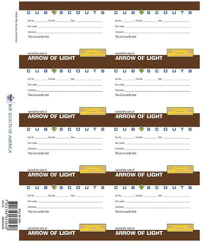 Each Cub Scout Pack is encouraged to use the Arrow of Light Pocket Certificate card to recognize each Cub Scout who earns the Arrow of Light rank. Certificate includes spaces for entering the Cub Scout’s name, den number or den name, Pack number, and date the rank was earned, along with den leader and Cubmaster signatures.